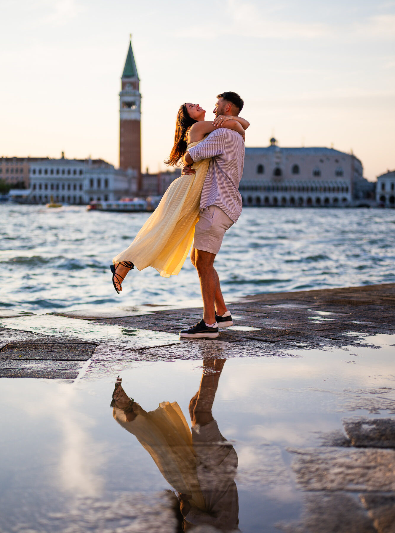 • Couple kissing by the Grand Canal with St Mark’s Campanile in soft light
